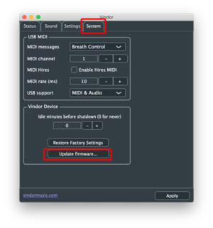 Using the Vindor control app, select the System tab and click on the Update Firmware button.