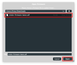 Navigate to the download folder and choose the firmware file downloaded. The latest firmware is on our Download Page.